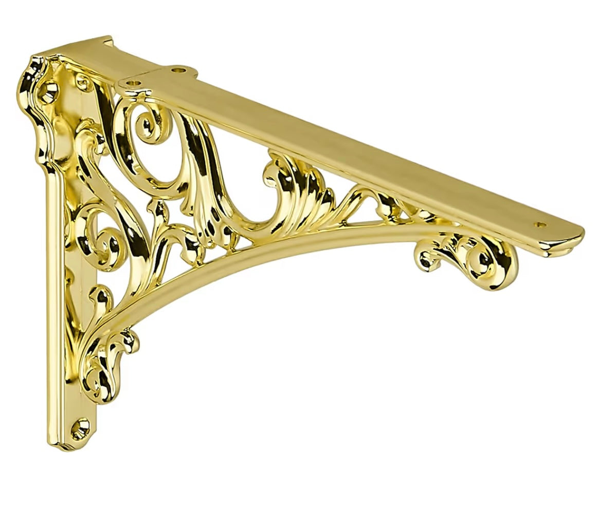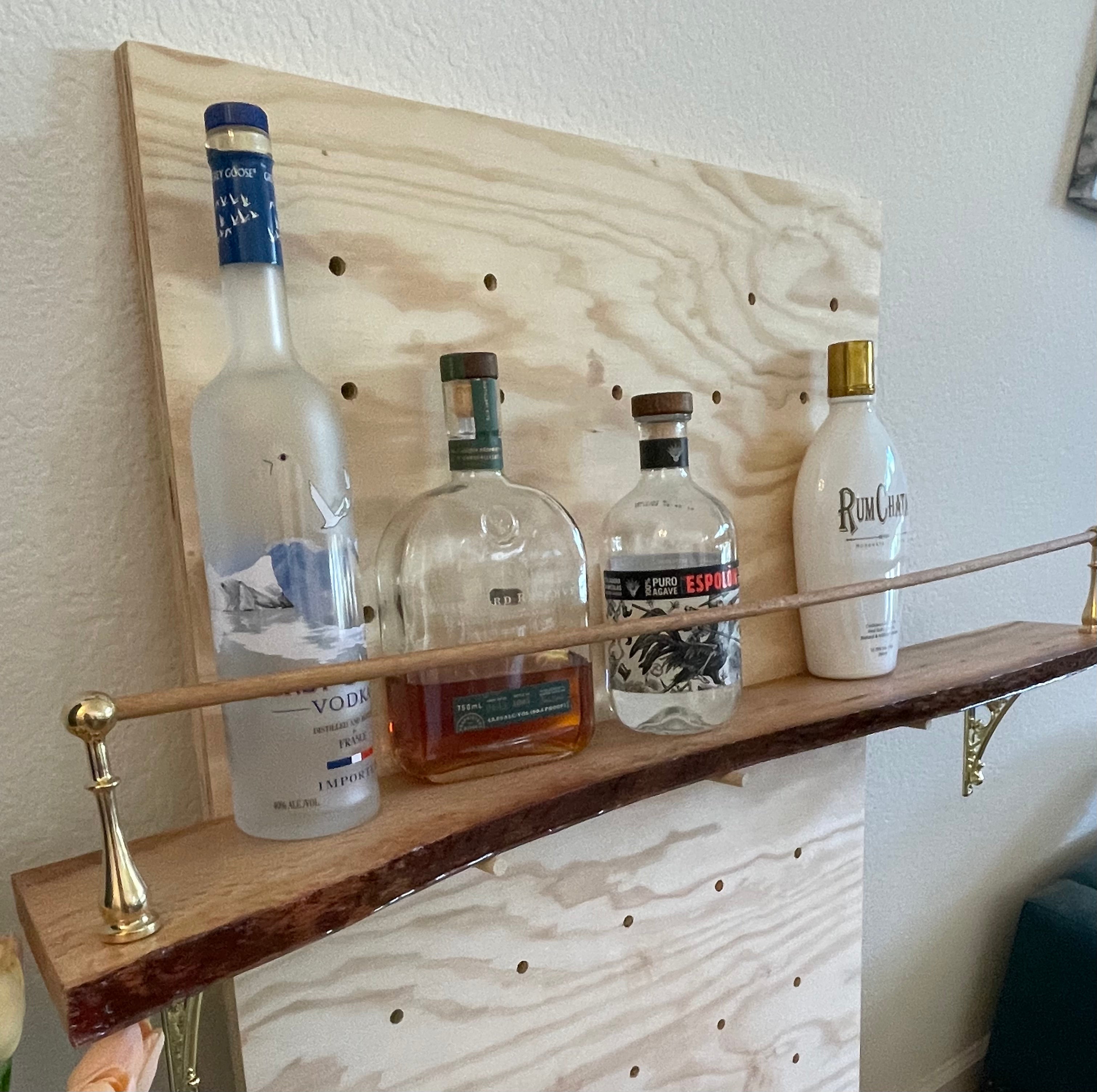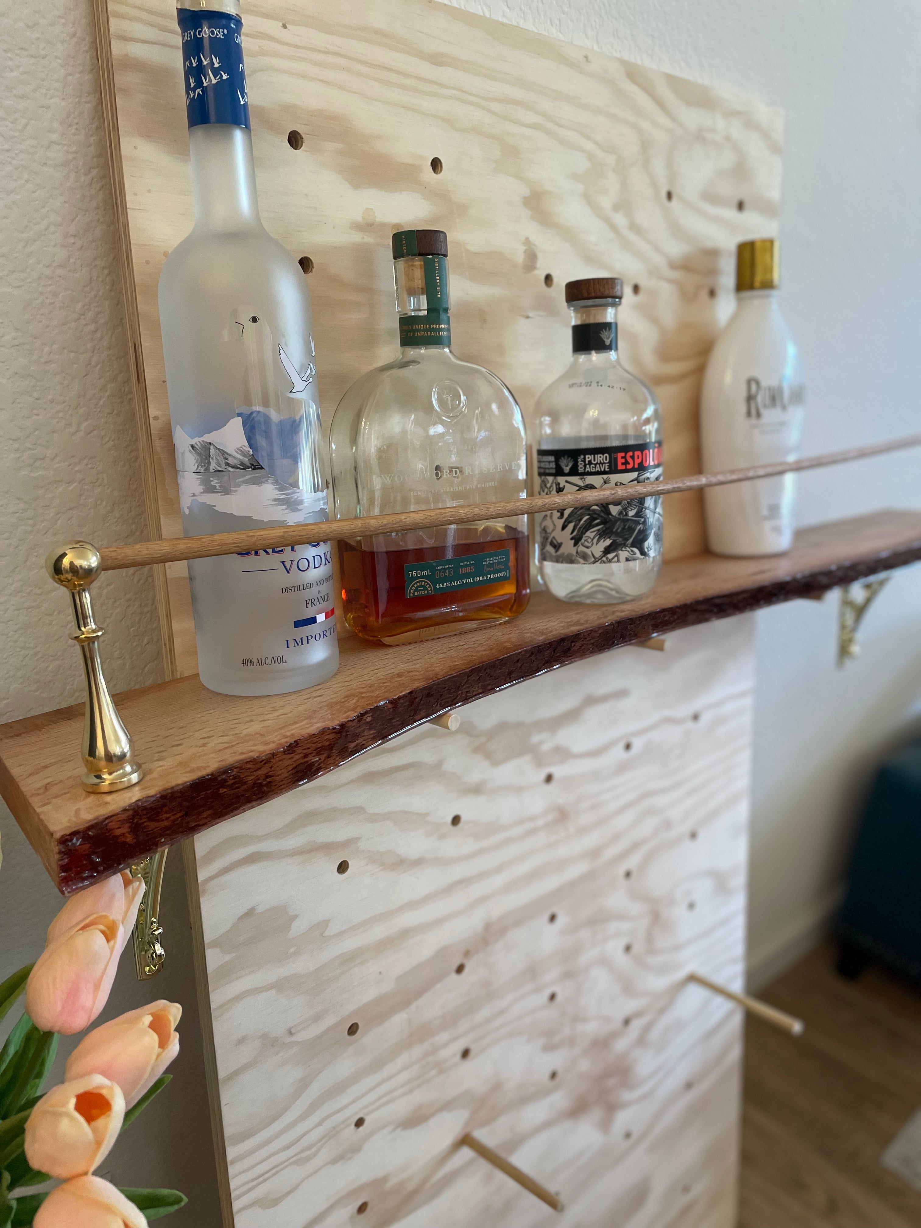 This gorgeous live-edge oak bar shelf will transform any home bar. The real brass and wood tipping rail adds a layer of intrigue and safety to the bar shelf by protecting bottles from accidentally sliding off. Polished brass brackets included, as shown.
