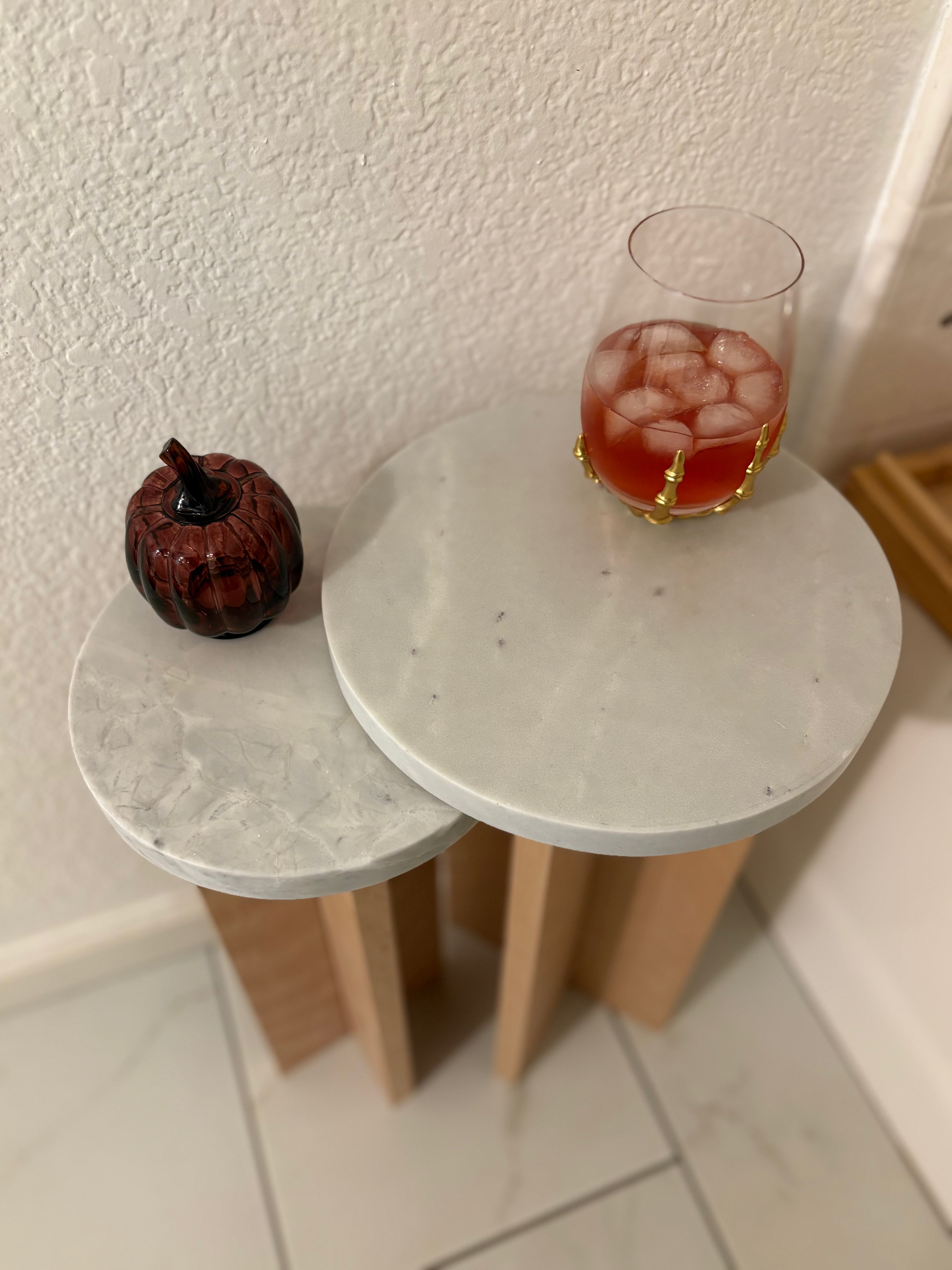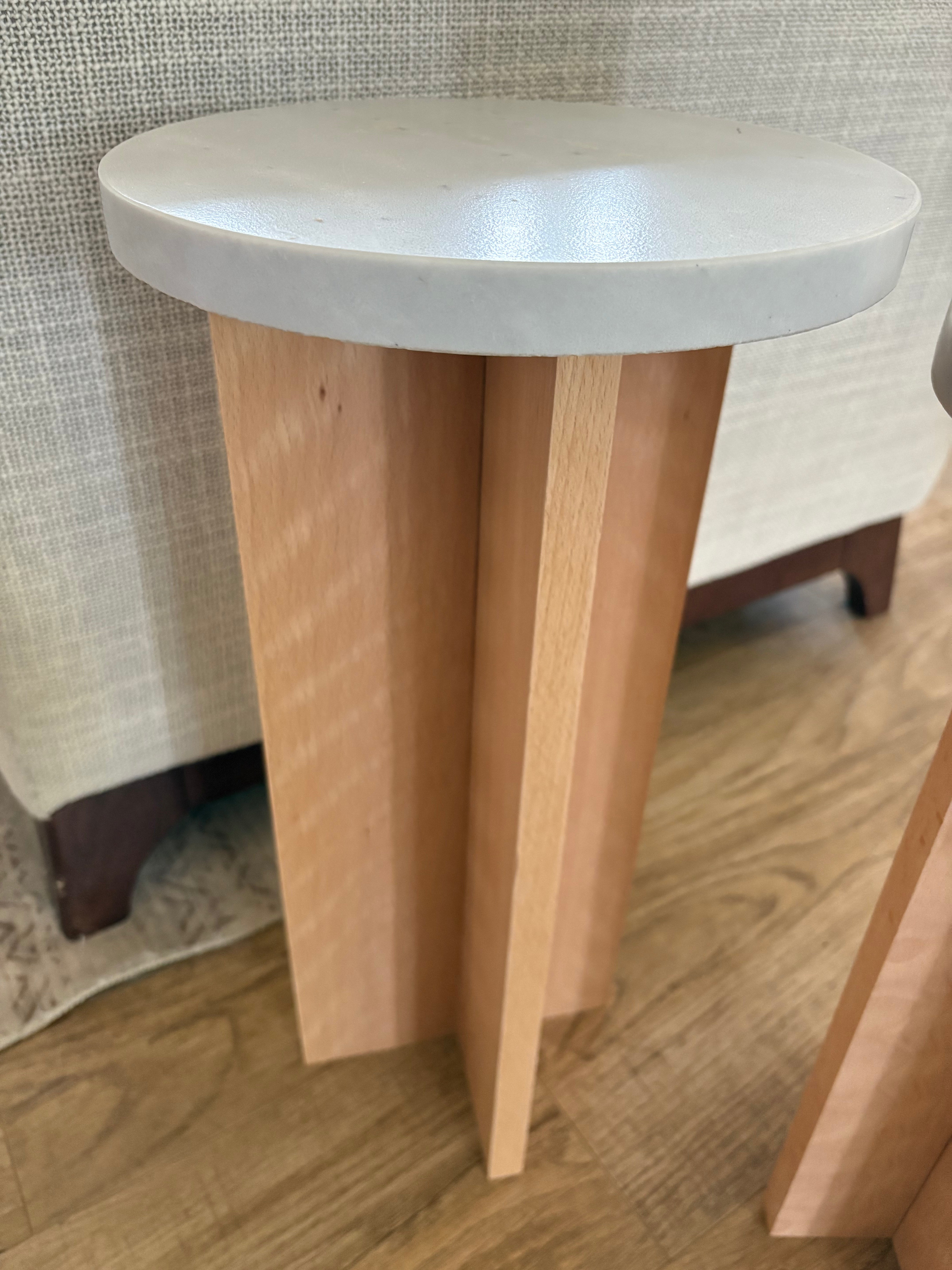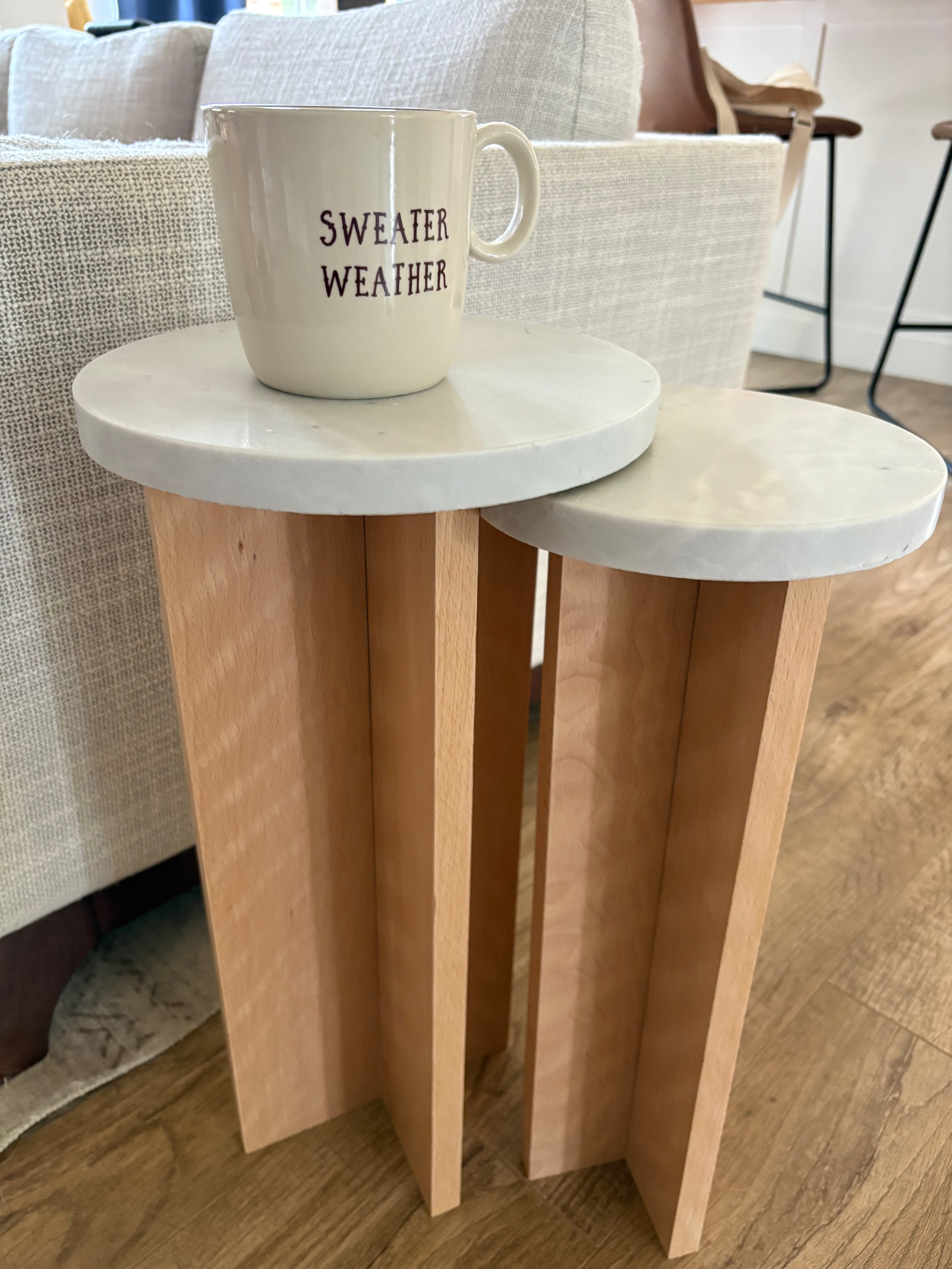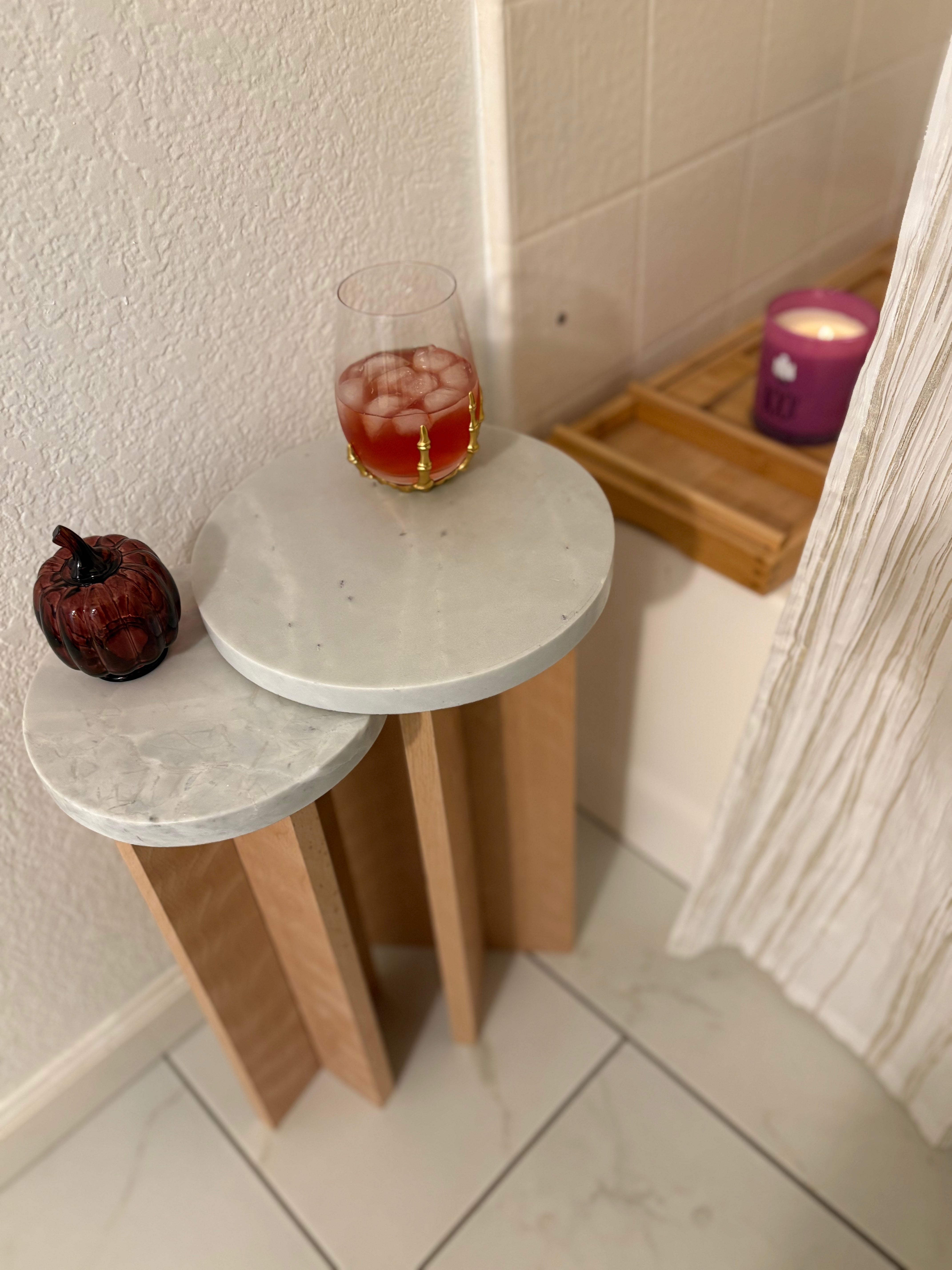Beech hardwood and real marble nesting tables. Perfect as plant shelves, bathroom tables, or accent tables around the home. Best on solid, level flooring such as wood, vinyl, or tile. Set of two.