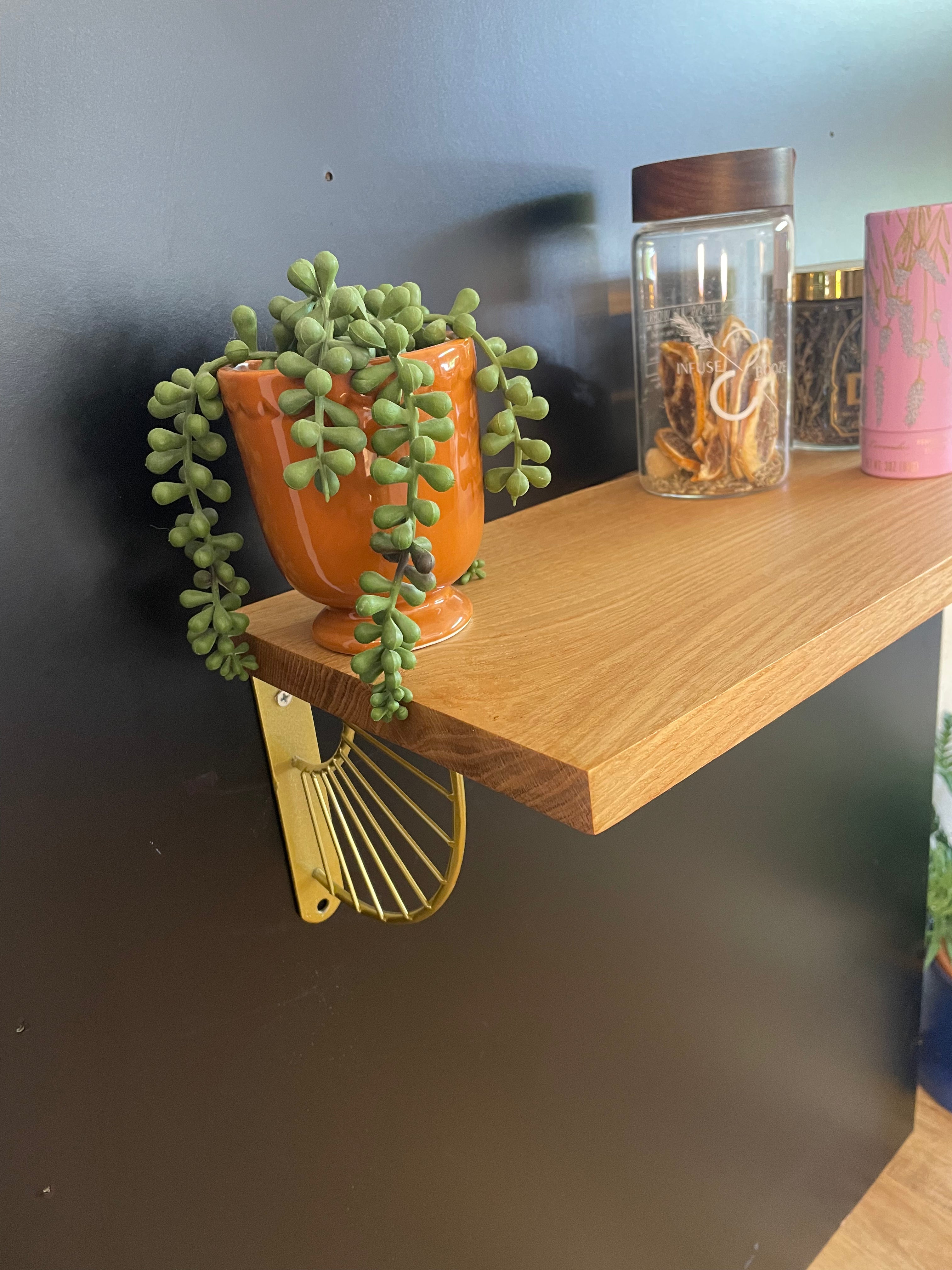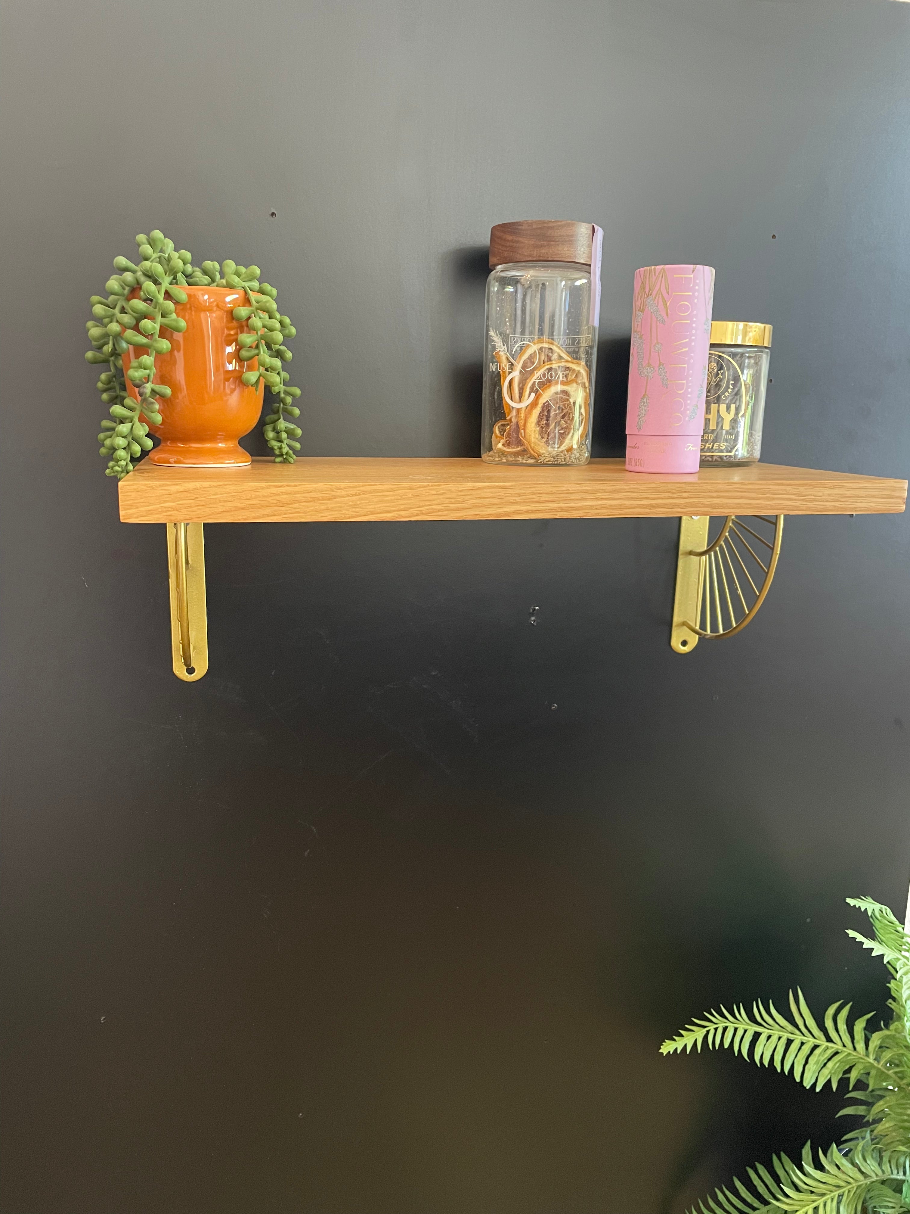 This white oak shelf will brighten up any wall with its sunburst brackets and shiny, natural finish. Perfect as a display shelf and wide enough to accommodate folder organizers and office paperwork.